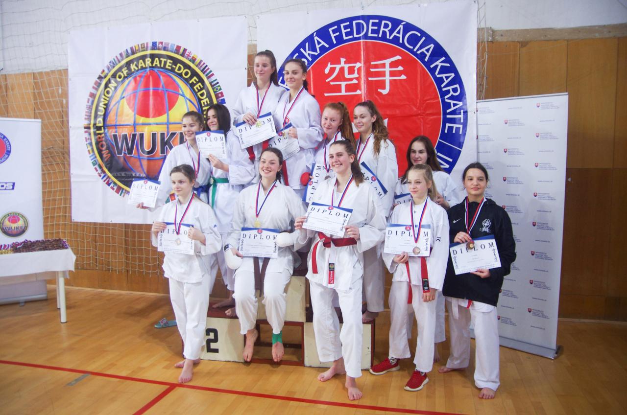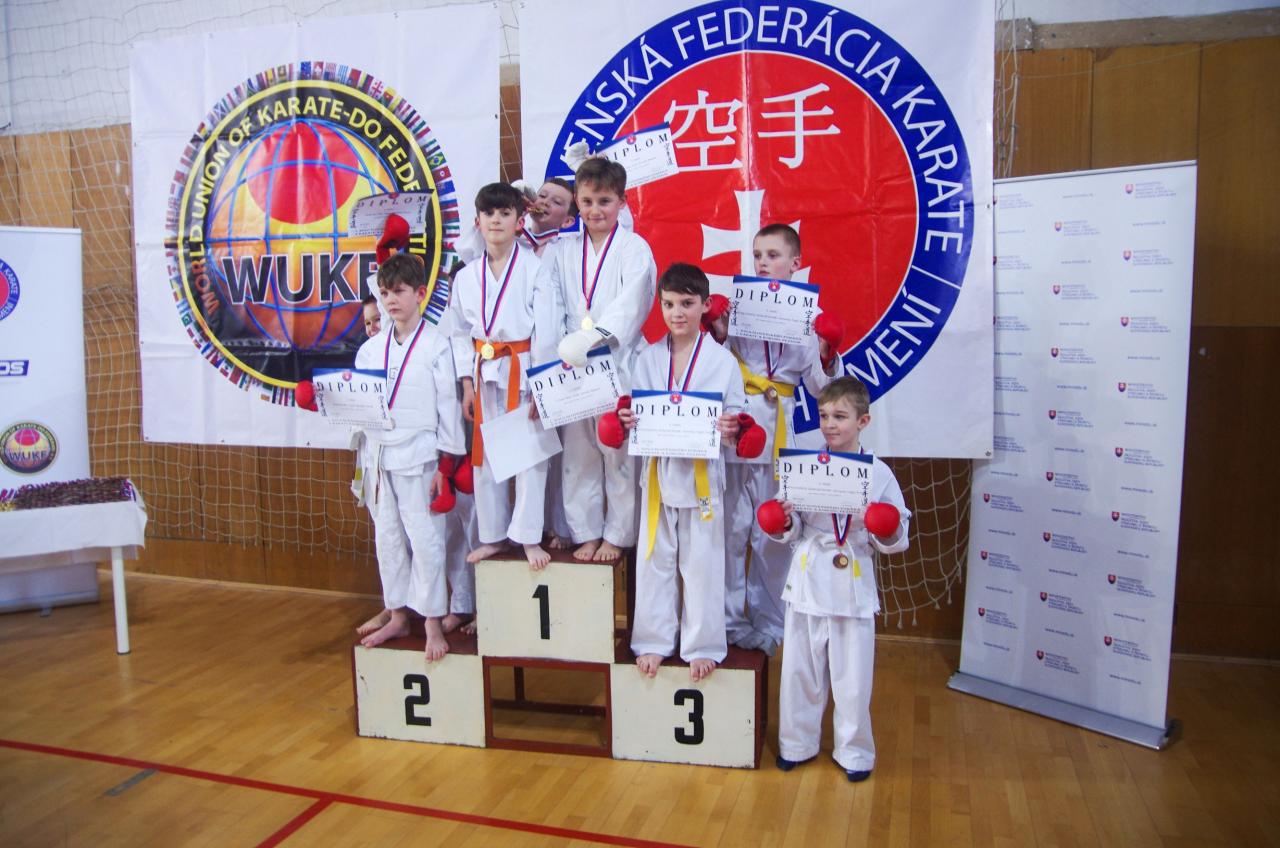 Dievčatá v družstvách taktiež nenašli premožiteľky a vyhrali s prehľadom všetky zápasy. Chlapci 10 až 11 - roční v družstvách vypadli, lebo nám chýbali pre chorobu niektorí naši pretekári. Družstvo 13 až 14 -ročných chlapcov statočne vybojovalo 3. miesto. Timo Horák odcvičil svoje cvičenie Kata výborne. V silnej konkurencii pretekárov z reprezentácie získal bronz.