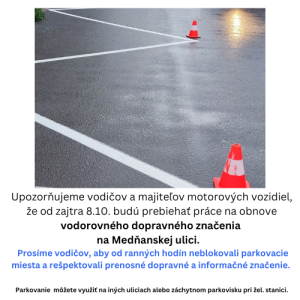 Obnova vodorovného dopravného značenia pokračuje. Od utorka v závislosti od počasia bude prebiehať na Medňanskej ulici.