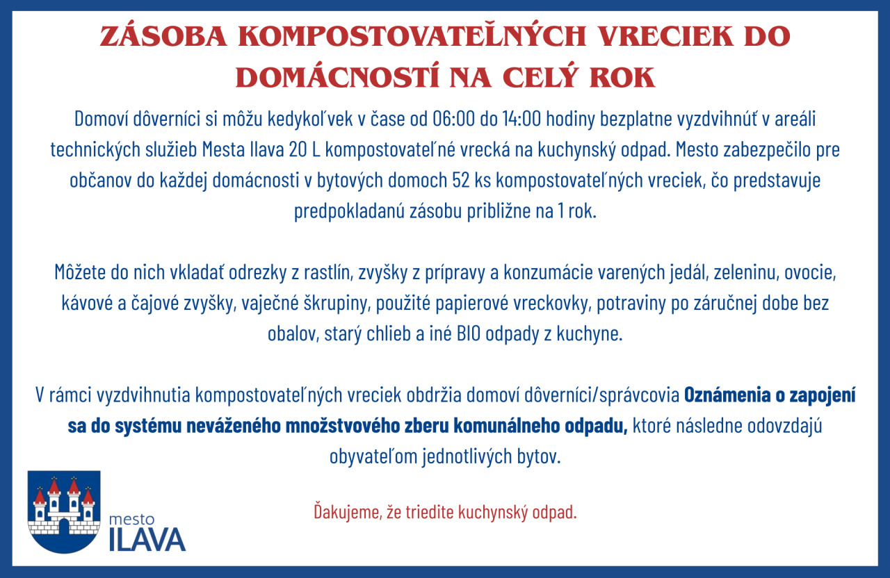 Mesto Ilava oznamuje občanom, že od utorka dňa 01.07.2025 si môžu kedykoľvek v čase od 06:00 do 14:00 hodiny bezplatne vyzdvihnúť v areáli technických služieb Mesta Ilava 20 L kompostovateľné vrecká na kuchynský odpad. Distribúcia kompostovateľných vreciek bude prebiehať prostredníctvom domových dôverníkov.