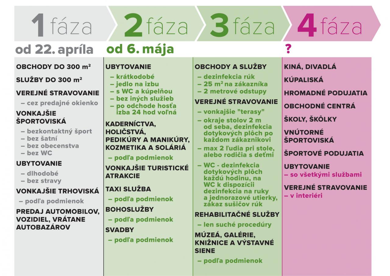 Od stredy 6.mája 2020 od 6.00 hod. môžu byť otvorené prevádzky, vonkajšie terasy, kaderníctva, holičstvá, kozmetika či manikúra a pedikúra. Povoľuje sa konanie bohoslužieb, prevádzka taxislužieb, činnosť autoškôl i rehabilitačné služby.