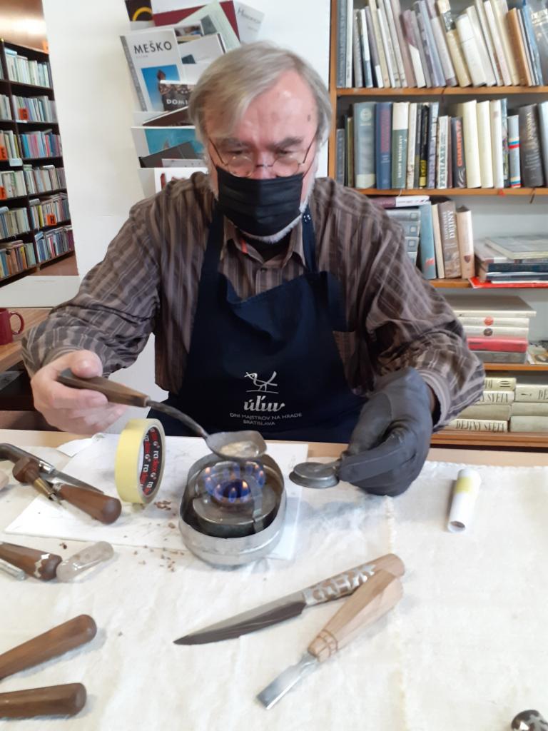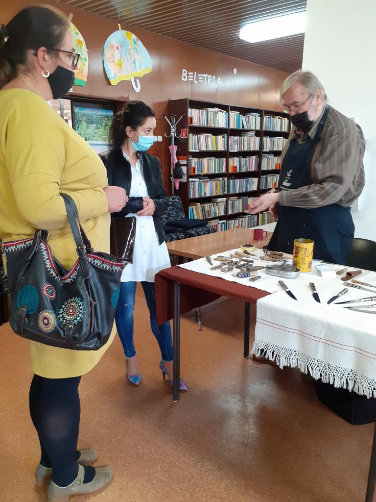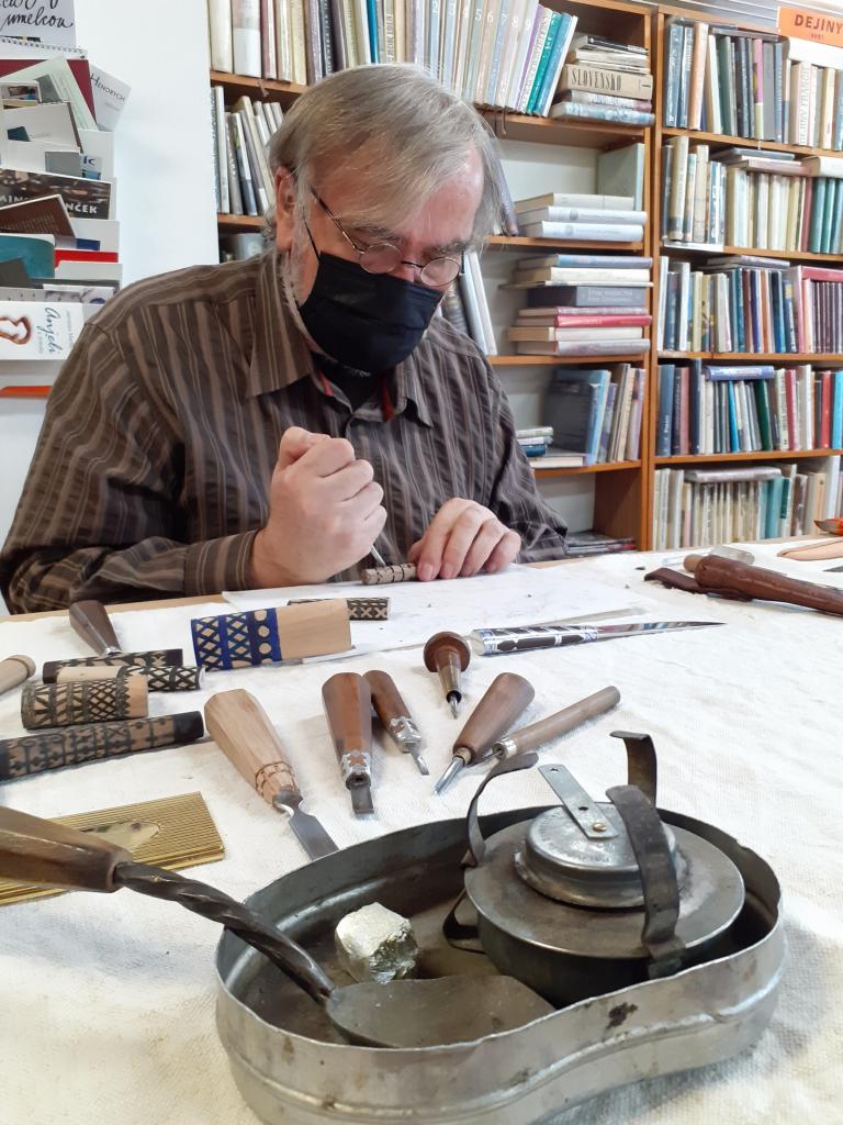 MILAN LÁTKA sa venuje ručnej výrobe pastierskych nožov. Sú to bohato zdobené repliky nálezov z rôznych regiónov Slovenska, ktorých vlastní už takmer stovku. Ako nám povedal: „všetci na Slovensku vieme, že čo dedina, to iná košeľa, iný kroj, no môžeme sa pochváliť aj tým, že každý región mal aj vlastné dekorovanie nožíkov.“ Rúčky sú vyrobené väčšinou z dreva ovocných stromov a ornamenty na nich sú vylievané tekutým cínom. Ukázal nám nôž, aký sa používal v Ilave (na samostatnej fotografii) a ďalší v Iliavke. Pôvodné čepele sa bežne recyklovali zo zlámaných nožov, využili sa aj zlomené kosy. Teraz majster používa hlavne nožiarsku nerez. V minulosti sa tieto nožíky používali na bežné práce pri chovoch oviec, spracovanie mäsa, prípadne ako zbraň (nosili sa pripevnené na boku pastierskej kapsy). V dnešných časoch sú skôr vhodným darom pre ľudí, čo vedia oceniť precíznu ručnú robotu. O tom sa mohli presvedčiť aj návštevníci knižnice, jednotlivé techniky im majster ochotne predviedol.