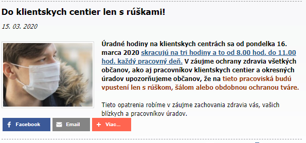 Úradné hodiny na klientskych centrách sa od pondelka 16. marca 2020 skracujú na tri hodiny a to od 8.00 hod. do 11.00 hod. každý pracovný deň. Ministerstvo vnútra SR v záujme ochrany zdravia všetkých občanov, ako aj pracovníkov klientskych centier a okresných úradov upozorňuje občanov, že na tieto pracoviská budú vpustení len s rúškom, šálom alebo obdobnou ochranou tváre. Ministerstvo upozorňuje, že tieto opatrenia sa robia v záujme zachovania zdravia vás, vašich blízkych a pracovníkov úradov.
