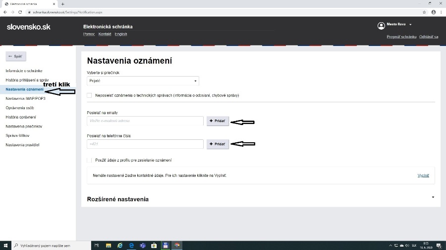 Pre každého používateľa, ktorý má aktivovanú osobnú elektronickú schránku, je výhodné si nastaviť oznámenie (notifikáciu ) o tom, že má vo svojej schránke novú správu. Vykonať si to môže v troch krokoch, v treťom formulári si vyberie, či chce oznam do svojej mailovej schránky alebo do SMS mobilu.