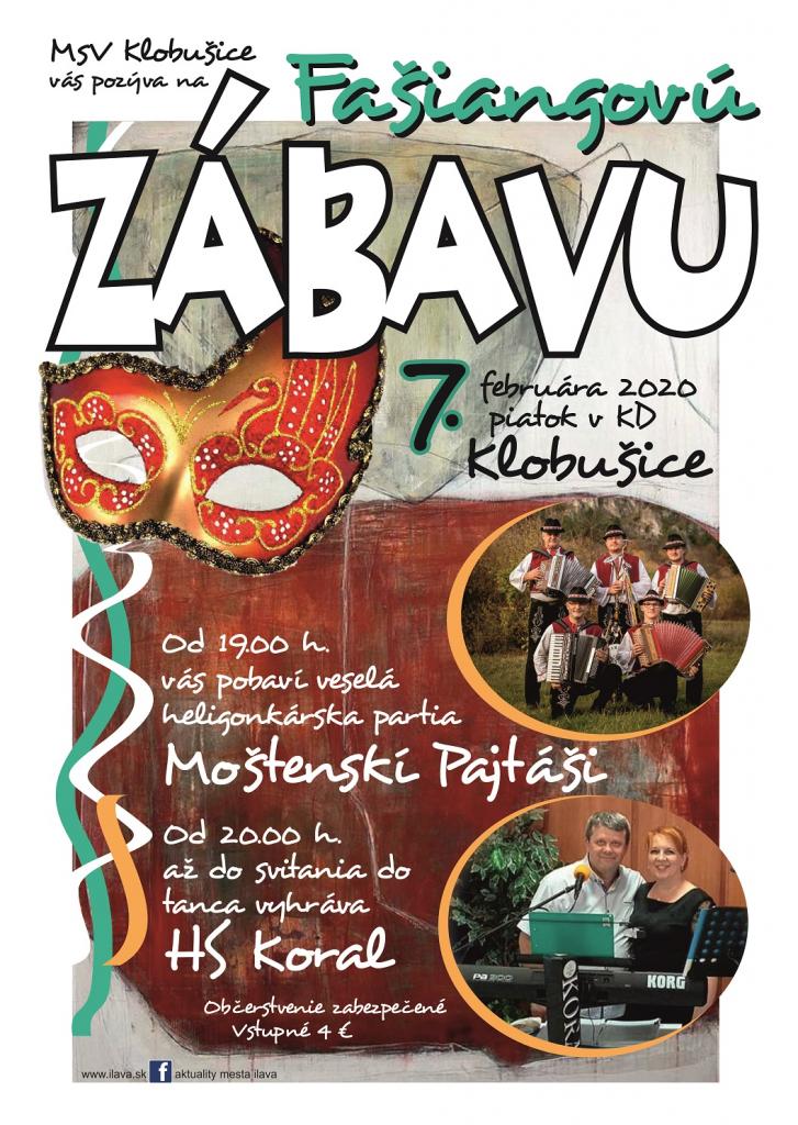 Na svoje si prídu Ilavčania, ale aj obyvatelia mestskej časti Klobušice. Oslavy odštartujú v piatok 7. februára FAŠIANGOVOU ZÁBAVOU v Kultúrnom dome v Klobušiciach. Od siedmej hodiny večer so svojimi heligónkami rozprúdia zábavu Moštenskí Pajtáši a o ôsmej ich vystrieda hudobná skupina Koral, ktorá sa postará o výbornú zábavu až do svitania.