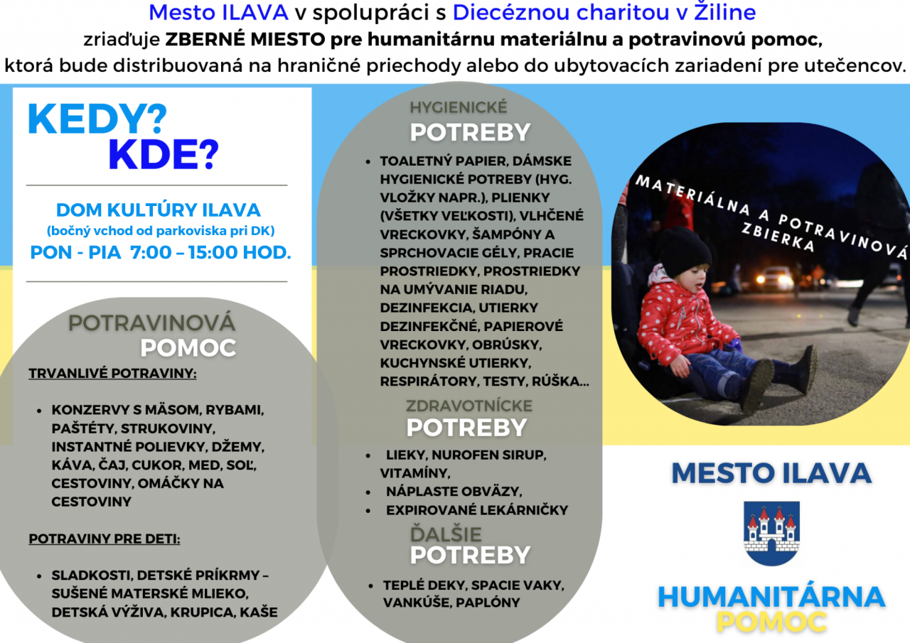 Naďalej zbierame potravinovú a humanitárnu pomoc pre pomoc odídencom z Ukrajiny. Zberné miesto zostáva nezmenené - Dom kultúry Ilava (použite bočný vchod od parkoviska pri DK).