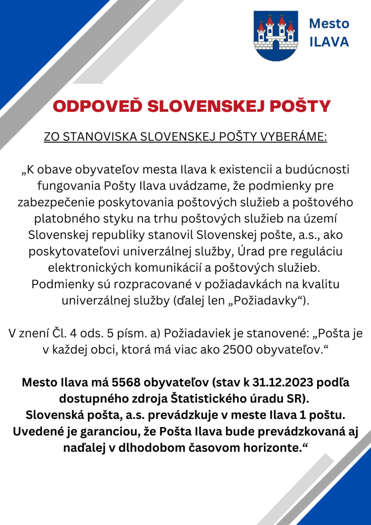 „K obave obyvateľov mesta Ilava k existencii a budúcnosti fungovania Pošty Ilava uvádzame, že podmienky pre zabezpečenie poskytovania poštových služieb a poštového platobného styku na trhu poštových služieb na území Slovenskej republiky stanovil Slovenskej pošte, a.s., ako poskytovateľovi univerzálnej služby, Úrad pre reguláciu elektronických komunikácií a poštových služieb. Podmienky sú rozpracované v požiadavkách na kvalitu univerzálnej služby (ďalej len „Požiadavky“).