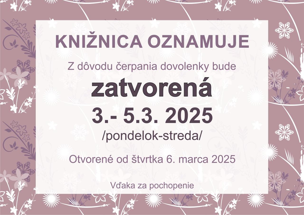 V dňoch 3.-5.marca 2025 bude zatvorená