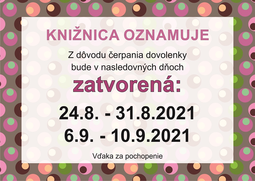 Z dôvodu čerpania dovolenky bude v nasledovných dňoch zatvorená: