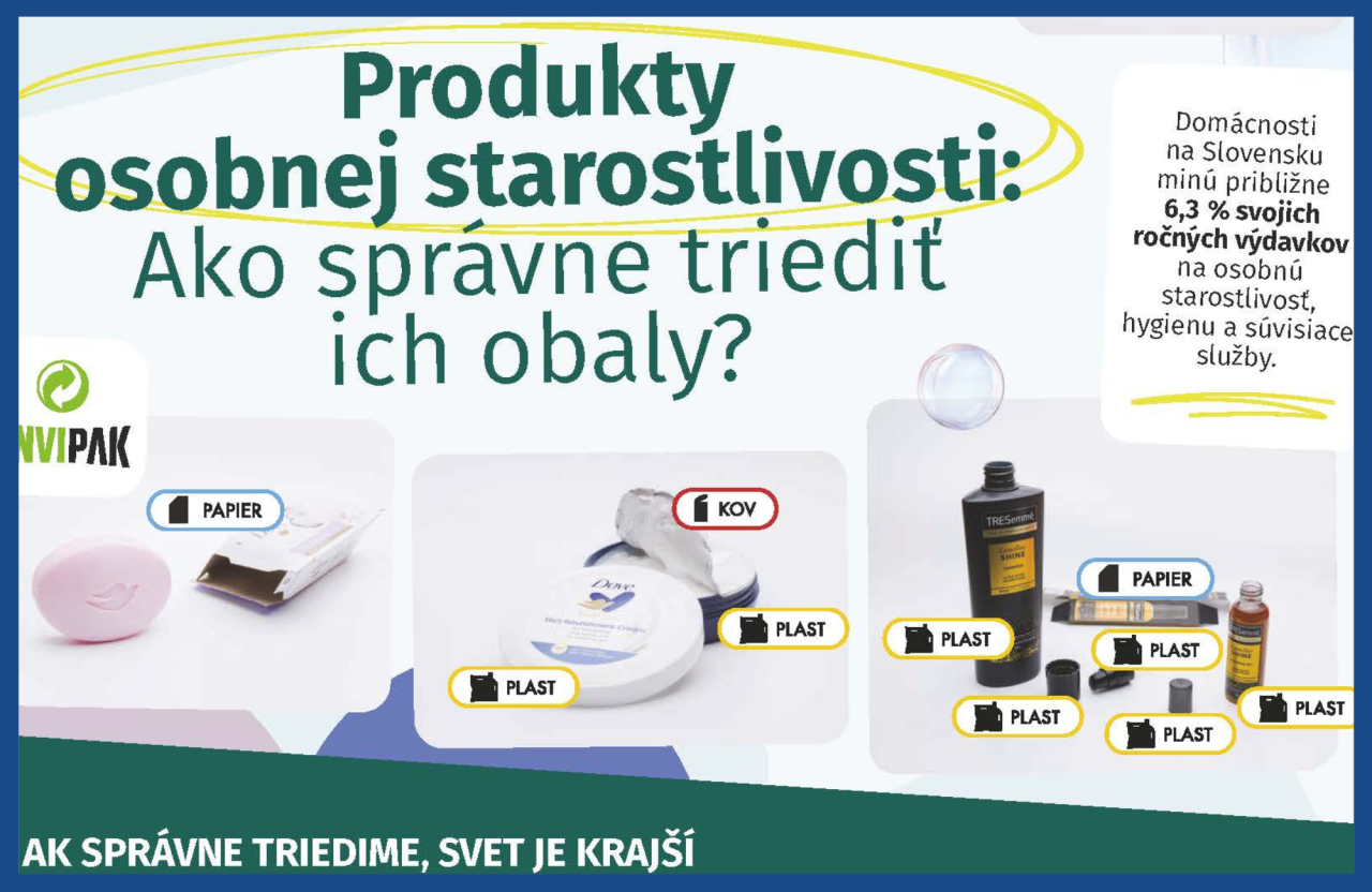 Na osobnú starostlivosť míňajú domácnosti nezanedbateľnú časť svojho rozpočtu – približne 6,3 percenta všetkých výdavkov. Ide o stabilnú položku, ktorá sa v rodinných rozpočtoch drží dlhodobo, no v závere roka ešte výraznejšie stúpa. „Výdavky na osobnú starostlivosť nie sú sezónnou témou, ide o bežnú a pravidelnú spotrebu. V decembri však domácnosti predsa len nakupujú o niečo viac. Jednak preto, že dopĺňajú vlastné zásoby, ale tiež preto, že kozmetika patrí medzi darčeky, ktoré sa pod vianočným stromčekom objavujú najčastejšie. To prirodzene znamená aj vyšší počet obalov, ktoré je potrebné po sviatkoch správne vytriediť,“ hovorí Katarína Kretter, riaditeľka komunikácie OZV ENVI - PAK, spoločnosti, ktorá sa dlhodobo venuje vzdelávaniu verejnosti o tom, ako triediť.