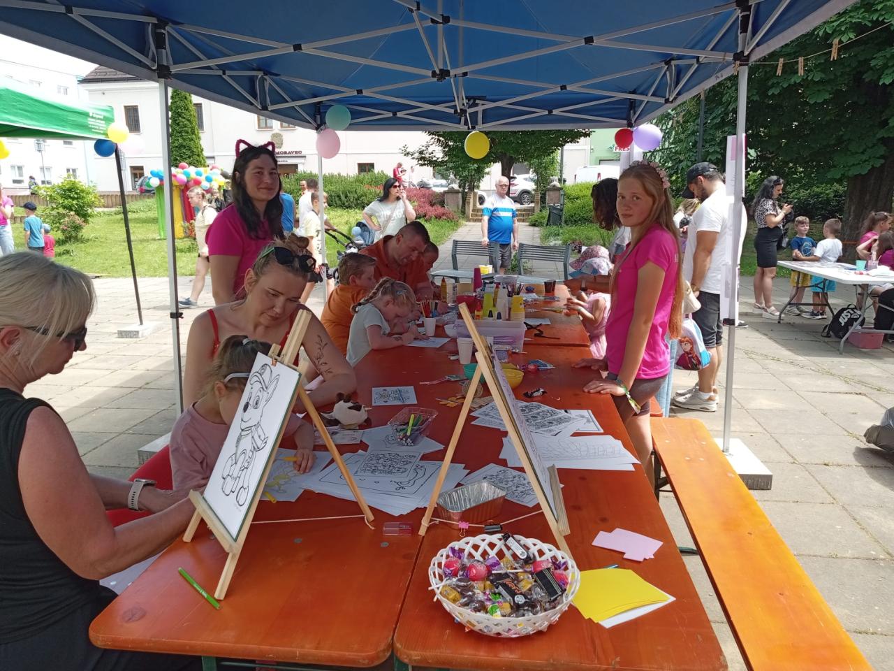 Veľký úspech mali aj tvorivé dielničky, kde si deti vyrábali náramky z korálok, roztomilé zvieratká z farebných drôtikov a maľovali na veľkú fóliu rozprestretú medzi stromami v parku. Nechýbal ani obľúbený penový šerm a pre tých najmenších hra „Kŕmenie draka Bonifáca“ loptičkami.
