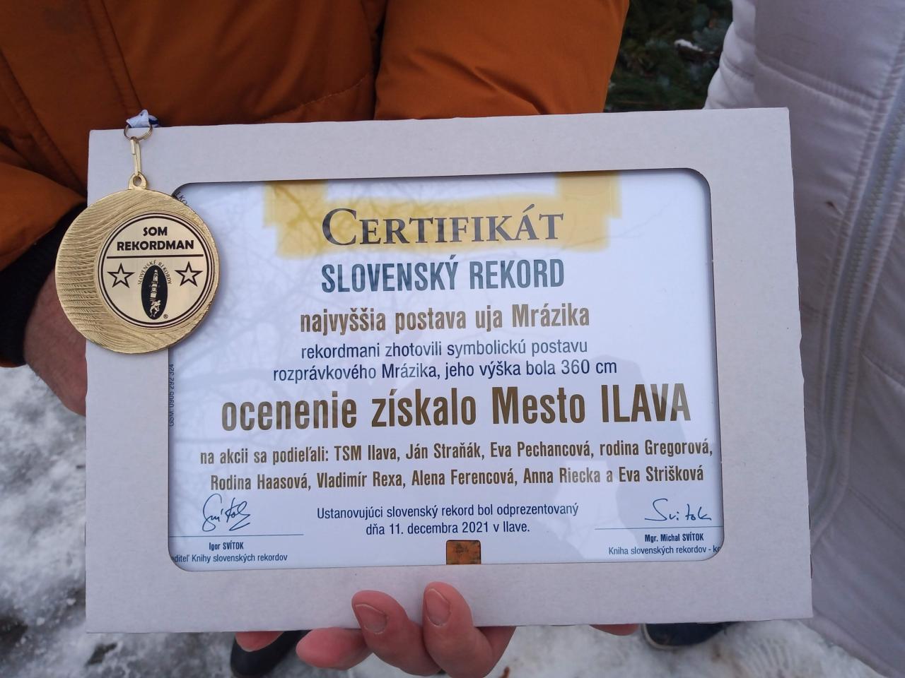 ,,Dnes tu máme postavu Mrázika. Rekordmanom z Ilavy sa podarilo vytvoriť rozprávkovú postavu s výškou 360 centimetrov. Podielali sa na ňom rodina Straňáková, Pechancová, Gregorová, Haasová, Vladimír Rexa, Elena Ferencová, Anna Riecka a Eva Strišková," ozrejmil detaily rekordu I. Svítok, pričom ocenil tých, ktorí sa na zhotovení postavy Mrázika podieľali, ako aj zástupcu Mesta Ilava.