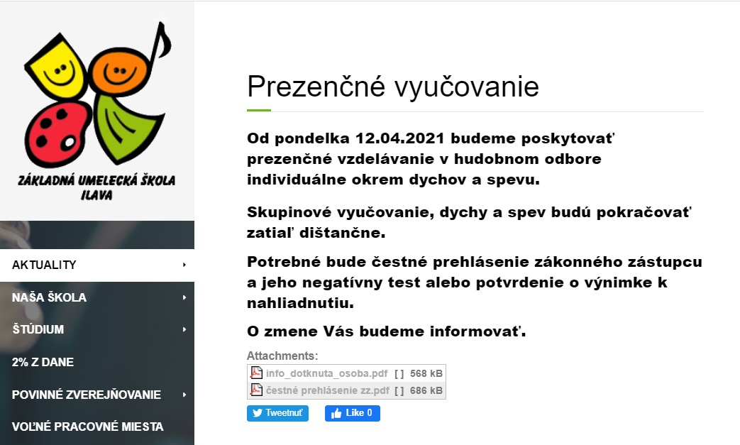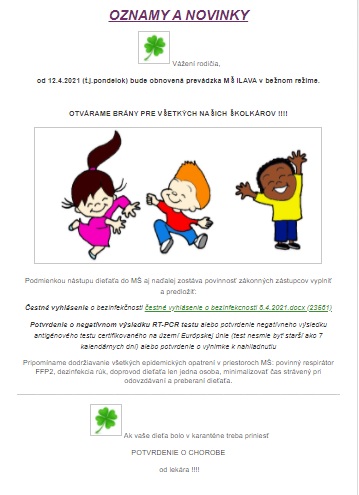 V prípade žiakov prvého stupňa základnej školy sa rozhodlo o pokračovaní v aktuálne nastavenom režime. Dobrá správa pre rodičov detí umiestnených v materských školách - zriaďovateľ rozhodol o otvorení tried pre všetky deti ako v Ilave, tak aj v Klobušiciach.