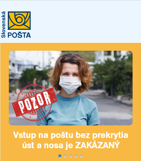 Slovenská pošta nevypláca ľuďom v karanténe sociálne dávky v hotovosti do vlastných rúk. Obyvateľ musí počkať na prebratie sociálnej dávky do času, kedy ukončí karanténu resp. kým sa situácia upokojí. Nepreberajte ani vaše zásielky. Poštári vám do schránky automaticky vložia tzv. žltý lístok, teda oznámenie o uložení zásielky. Zásielka vás počká na pošte viac ako 18 dní. Doba uloženia zásielok na pošte je predĺžená o 14 dní navyše.