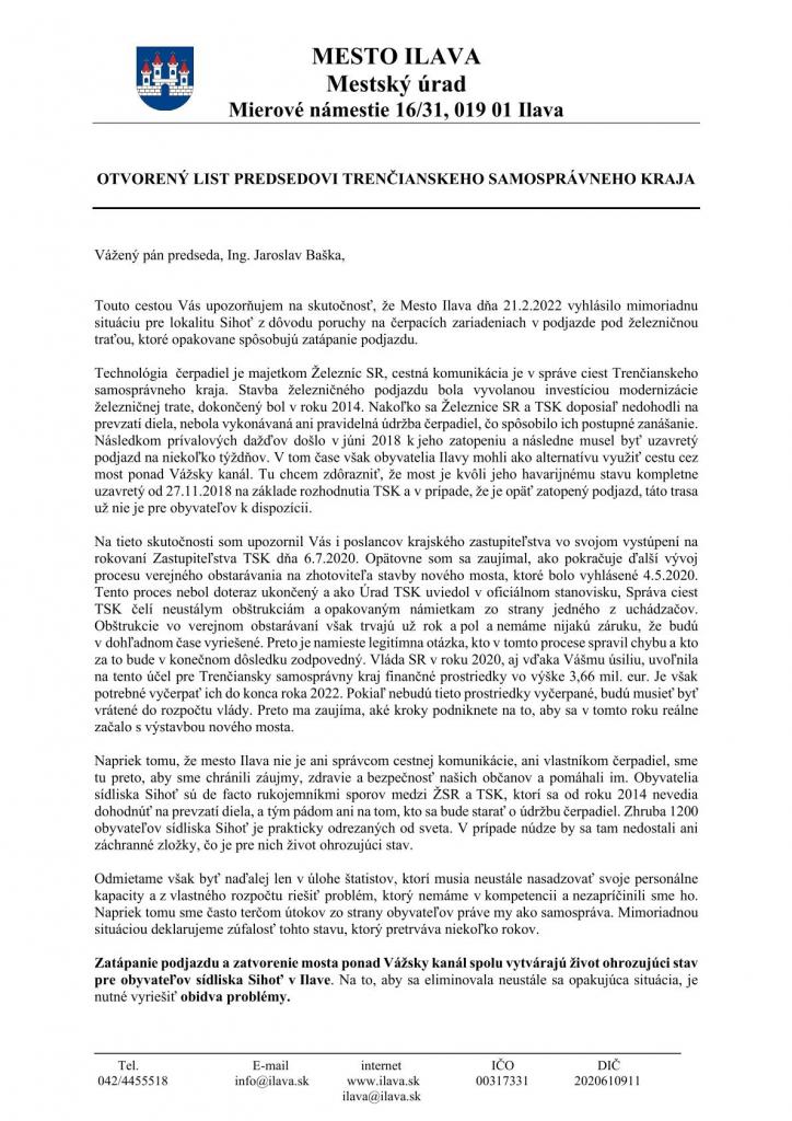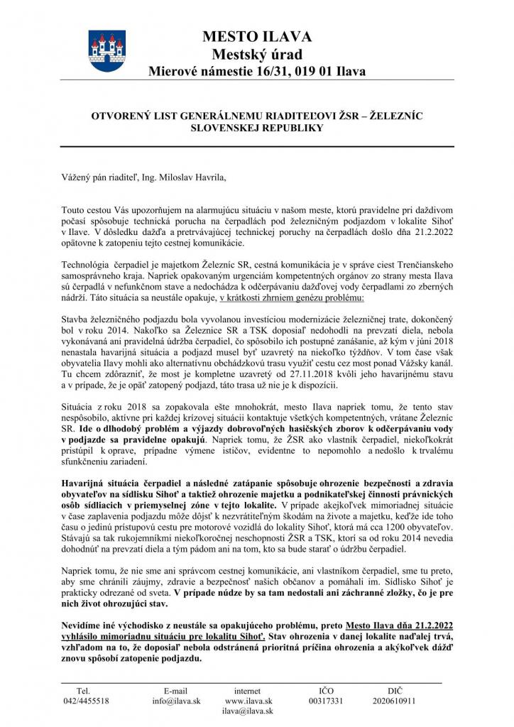 V pondelok 21. februára 2022 primátor mesta Ilava vyhlásil v lokalite Sihoť MIMORIADNU SITUÁCIU. Stalo sa tak po tom, čo nefunkčné čerpadlá v železničnom podjazde opätovne zapríčinili zaplavenie cestnej komunikácie, ktorá spája sídlisko Sihoť s ostatnými mestskými časťami. Nakoľko ide o dlhoročný stále sa opakujúci problém, ktorý značne skomplikovalo zatvorenie mosta ponad Vážsky kanál, nie je prípustné, aby kompetentní (ŽSR a TSK) nenašli riešenie trváleho odstránenia poruchy.