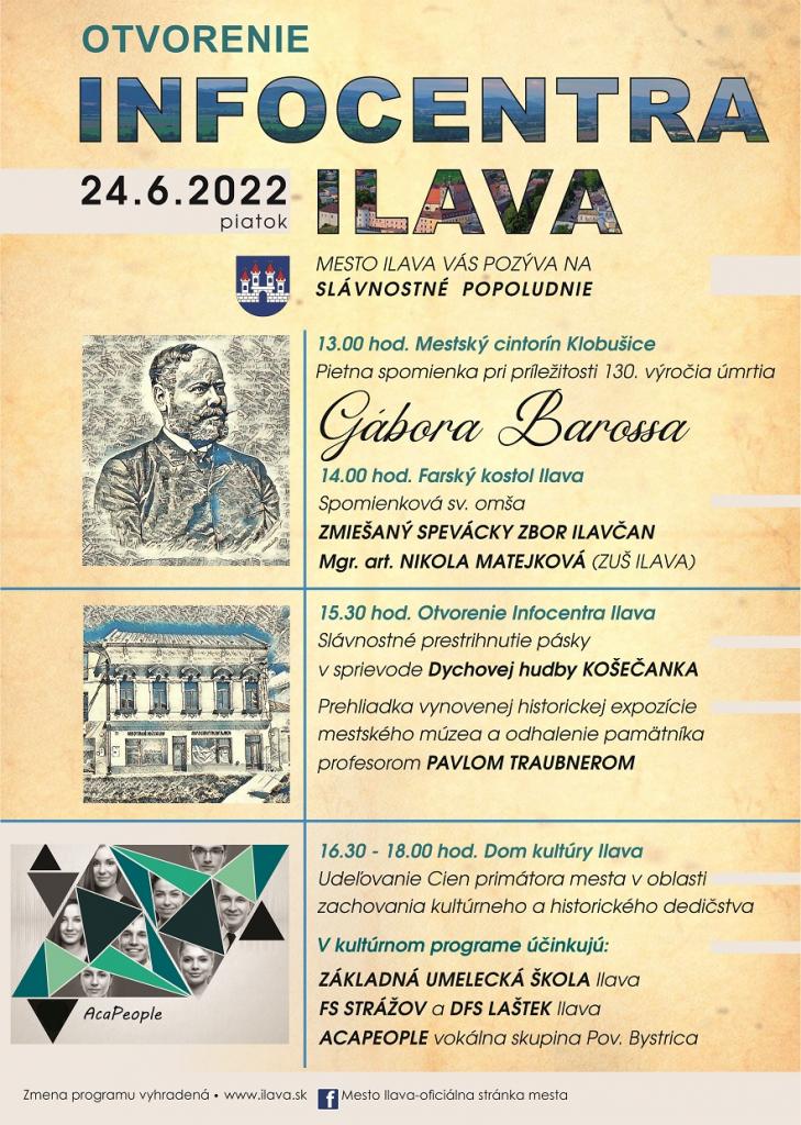 Program bude časovo rozdelený na niekoľko častí. Začíname na Mestskom cintoríne v Klobušiciach, kde si uctíme pamiatku Gábora Barossa. Presunieme sa do Ilavy do farského kostola, kde mu bude venovaná spomienková omša a po nej vystúpenie Zmiešaného speváckeho zboru Ilavčan a pedagogičky ZUŠ ILAVA Mgr.art. Nikoly Matejkovej. Následne sa program presunie do infocentra a múzea a k slávnostnému otvoreniu a prehliadke vynovenej historickej expozície mestského múzea. Od 16:30 hod. vás radi privítame na oficiálnom programe v Dome kultúry Ilava. Jeho súčasťou bude aj udeľovanie Cien primátora mesta a pripravili sme si pre verejnosť i vystúpenia domácich súborov a hostí.
