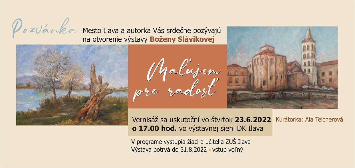 Časový harmonogram nájdete na plagáte, budeme radi, keď sa zúčastníme na celom slávnostnom popoludní, pridať sa však môžete na ktorúkoľvek časť.Do pozornosti dávame aj autorskú výstavu Boženy Slávikovej - jej vernisáž sa uskutoční vo štvrtok 23. júna o 17.00 hod., výstavu si budete môcť pozrieť aj počas slávnostného popoludnia v piatok vo výstavnej sieni (3. pochodie DK ILAVA). Príležitosť budete mať až do konca augusta.