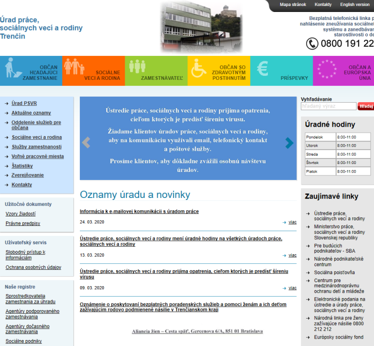 Riaditeľ Úradu práce a sociálnych vecí v Trenčíne, oznamuje počas krízovej situácie zmenu úradných hodín od 8:00 - 11:00 hod.