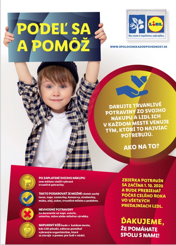 Od začiatku októbra prebieha v potravinovom reťazci Lidl nová kampaň „Podeľ sa a pomôž“. Jej cieľom je podieľať sa aj na riešení chudoby, sociálneho vylúčenia a s nimi spojenej potravinovej deprivácie. Ide o dlhodobý projekt potravinovej pomoci, do ktorého sa môže každý z nás aj v predajni v Ilave. Potravinová pomoc tak pôjde adresne rodinám priamo z nášho mesta, ktoré to najviac potrebujú.
