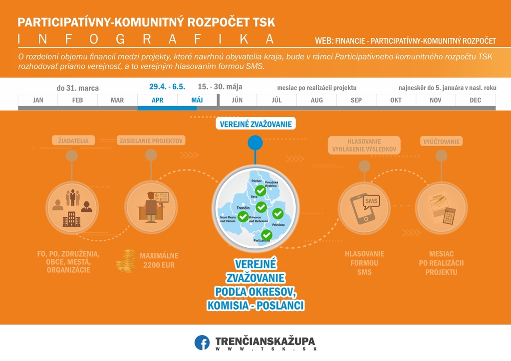 Finálnej realizácie sa však dočkajú iba zámery, ktoré získajú minimálne 150 SMS hlasov od hlasujúcich. Podporiť jednotlivé projekty svojím hlasom bude môcť verejnosť od 15. do 30. mája prostredníctvom SMS hlasovania. Náklady za textové správy občania neplatia, v plnej sume ich znáša Trenčiansky samosprávny kraj. Informácie o spôsobe hlasovania nájdete na webovej stránke kraja www.tsk.sk, v sekcii Financie, v rubrike Participatívny-komunitný rozpočet 2021.