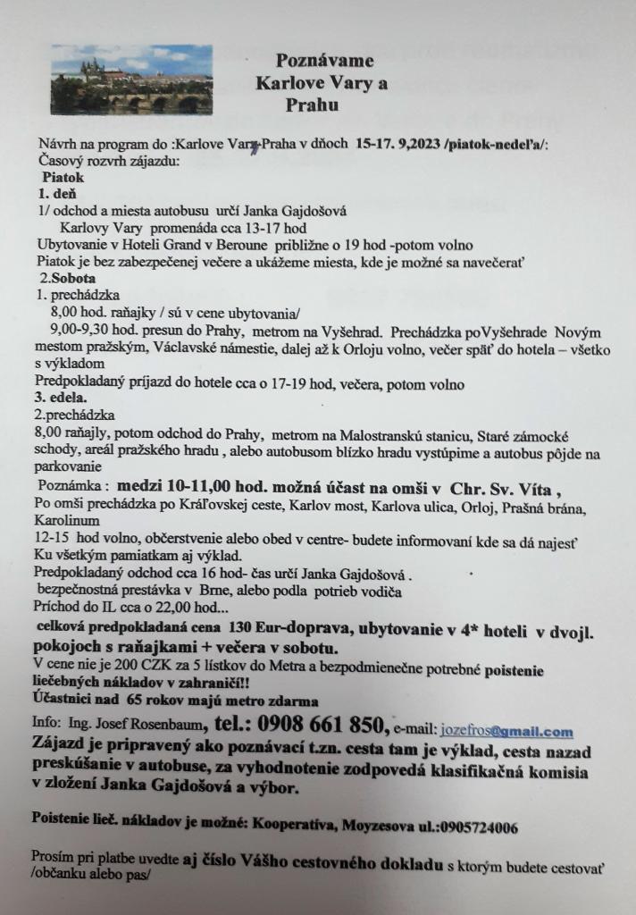 Členovia a sympatizanti, poďte s nami v dňoch 15.-17.9.2023 /piatok-nedeľa/ spoznávať nádherné české mestá. Viac informácií: Jana Gajdošová 0917 799 586 a Ing. Josef Rosenbaum 0908 661 850