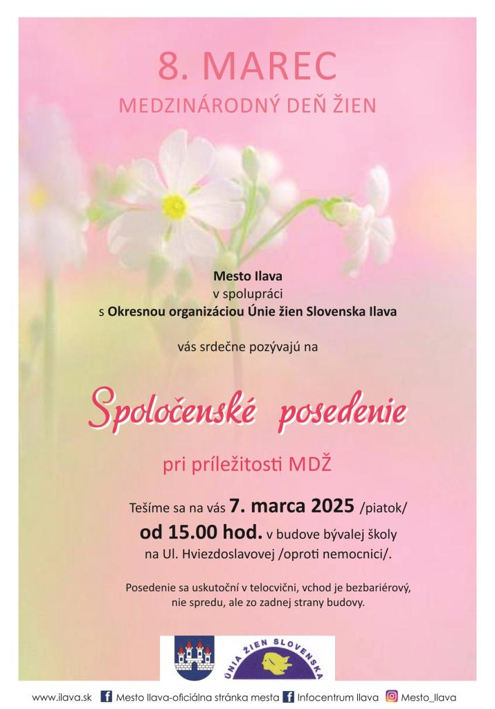 Mesto Ilava v spolupráci s Okresnou organizáciou Únie žien Slovenska Ilava vás srdečne pozývajú na SPOLOČENSKÉ POSEDENIE pri príležitosti Medzinárodného dňa žien.