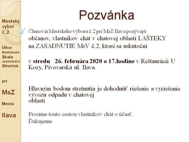 Členovia Mestského výboru č.2 pri MsZ Ilava pozývajú občanov, vlastníkov chát v chatovej oblasti LAŠTEKY na zasadnutie MsV č.2, ktoré sa uskutoční v STREDU 26.februára 2020 o 17,00 hod. v Reštaurácii U Kozy, Pivovarská ul. Ilava. Hlavným bodom stretnutia je dohodnúť riešenie vývozu odpadu v chatovej oblasti.