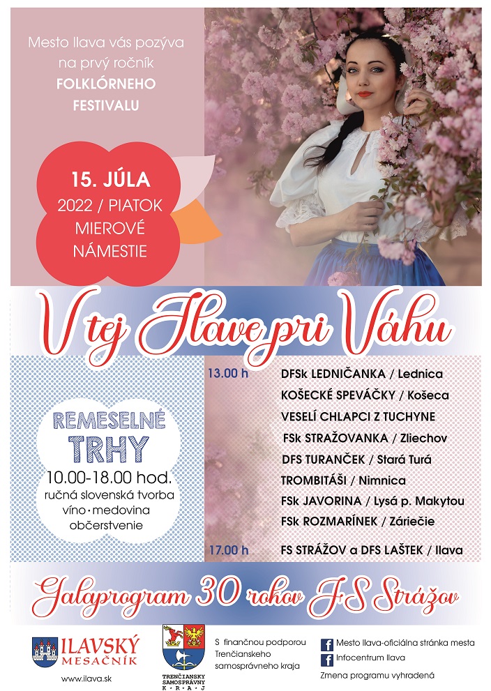 V piatok 15. júla 2022 sa bude konať prvý ročník folklórneho festivalu V TEJ ILAVE PRI VÁHU. Jeho nultý ročník sa konal počas protipandemických opatrení, no napriek tomu ho môžeme označiť za divácky i programovo úspešný. Bola by škoda z tohto pekného podujatia nevytvoriť tradíciu. Ruka v ruke s kultúrnym programom sa tak, ako aj minulý rok, budú konať remeselné trhy "Na ľudovú nôtu".