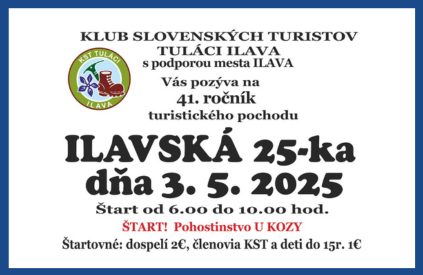 41. ročník Ilavskej 25-ky sa uskutoční v sobotu 3. mája 2025. Štartuje sa od pohostinstva U kozy od 6:00 do 10:00 hod.. Trasy sú vyznačené na mapke.
