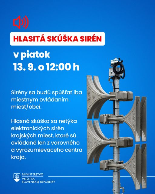 V piatok 13. septembra 2024 o 12:00 hod. bude v zmysle zákona č. 42/ 1994 Z.z. o civilnej ochrane obyvateľstva vykonané pravidelné preskúšanie varovnej siete sirén hlasitou skúškou na uzemí Slovenskej republiky, a to dvojminútovým stálym tónom.