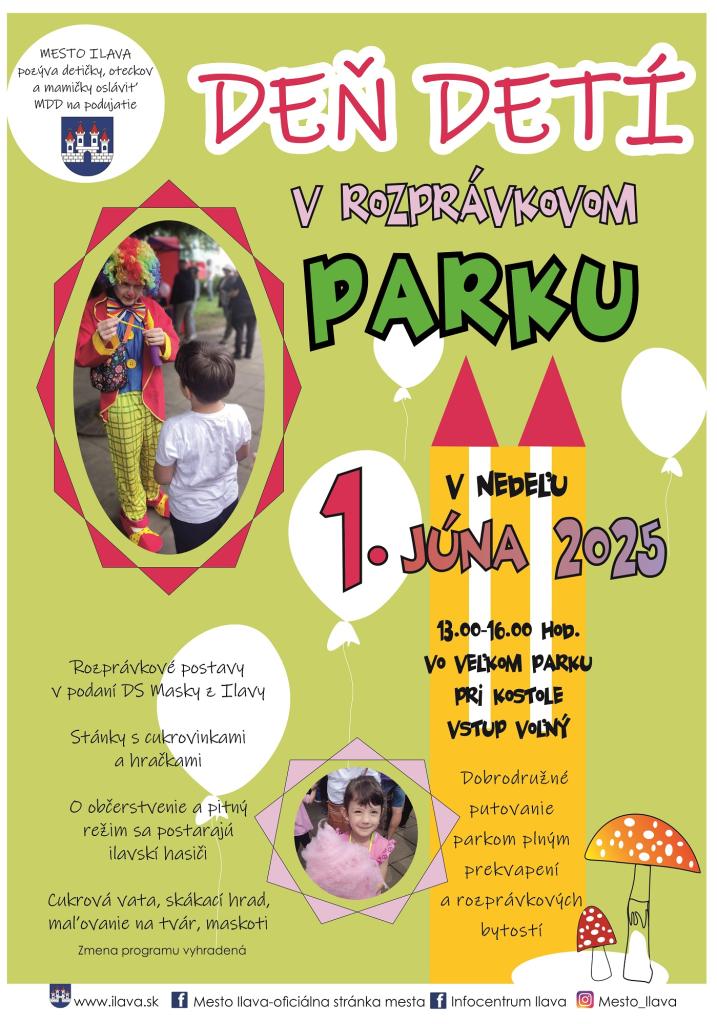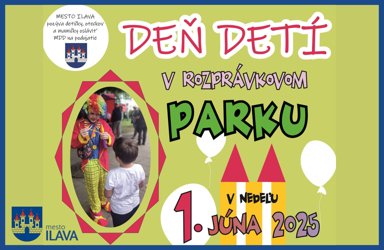 Mesto Ilava pozýva detičky, oteckov a mamičky osláviť Medzinárodný deň detí na podujatie DEŇ DETÍ V ROZPRÁVKOVOM PARKU, ktoré sa bude konať v nedeľu 1. júna 2025 od jednej do štvrtej hodiny popoludní.