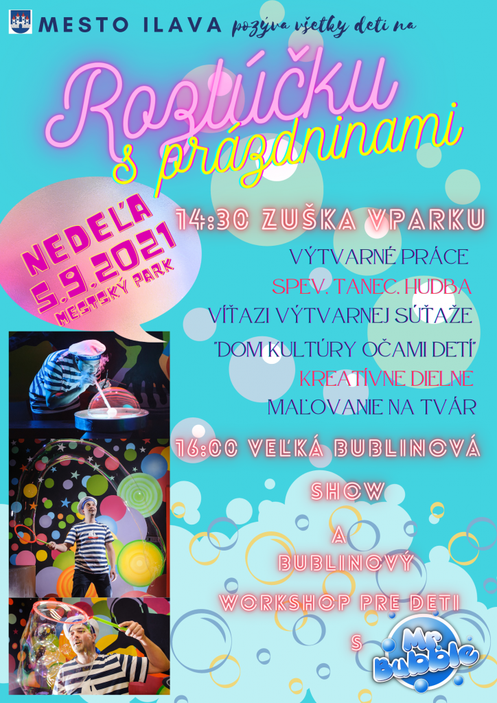 Okrem skvelého programu, o ktorý sa postarajú talenty zo Základnej umeleckej školy Ilava, nebudú chýbať ani tvorivé dielne, maľovanie na tvár pre deti a o 16:00 hod. príde MR. BUBBLE , ktorý nám všetkým vo svojom predstavení najskôr predvedie svoje bublinové umenie vo VEĽKEJ BUBLINOVEJ SHOW a po nej príde rad aj na zapojenie detí do bublinkovej zábavy v hodinovom BUBLINOVOM WORKSHOPE.