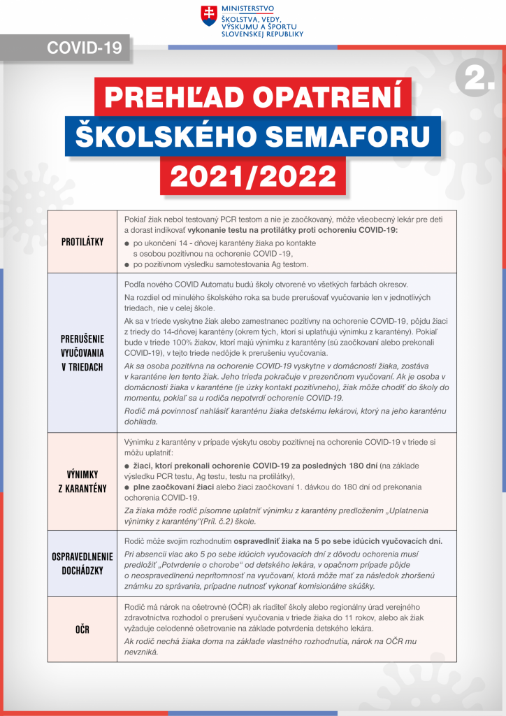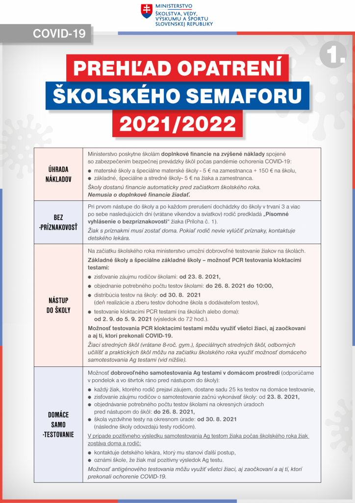 Nakoľko sa stále nachádzame v neľahkej situácii kvôli šíriacemu sa ochoreniu Covid-19 a vstupujeme do tretej vlny pandémie, ešte cez lez letné prázdniny bolo otázne, ako bude vyzerať nástup detí do školských zariadení. Našťastie je situácia ešte priaznivá a väčšina Slovenska sa nachádza v zelenej farbe Covid-automatu. Tento článok je síce dlhší, no pokúsili sme sa doň uviesť všetky dôležité informácie k tomu, ako by mal vyzerať školský rok 2021/2022 a čo všetko je potrebné doložiť pred nástupom detí do skôlky a žiakov do školy.