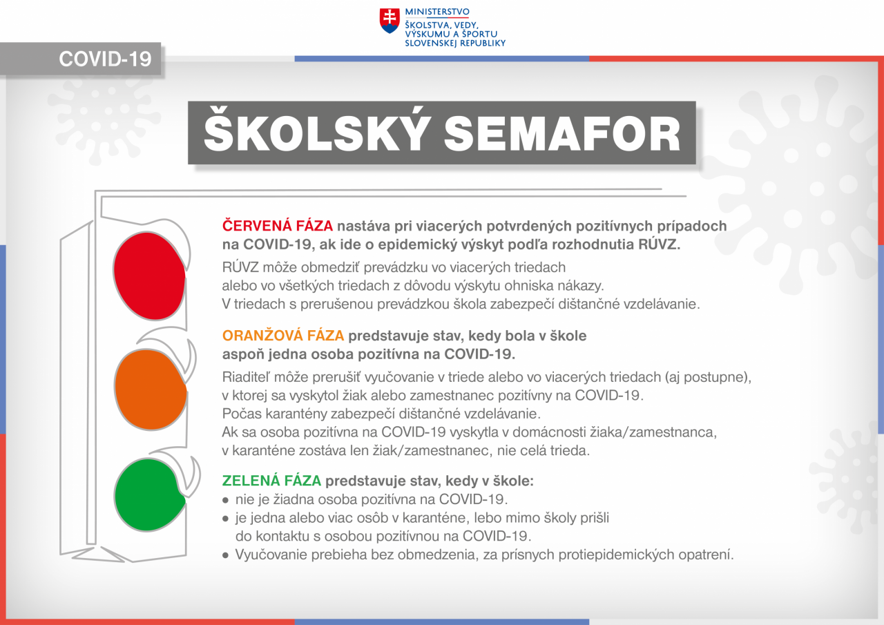 Všetky pravidlá nájdu školy v dokumentoch na webovom sídle ministerstva školstva. Školy sa budú riadiť takzvaným „Školským semaforom,“ ktorý poznajú z minulosti. Rezort odporúča minimalizovať miešanie tried, realizovať ranný filter, či zabezpečiť pravidelnú dezinfekciu priestorov škôl.
