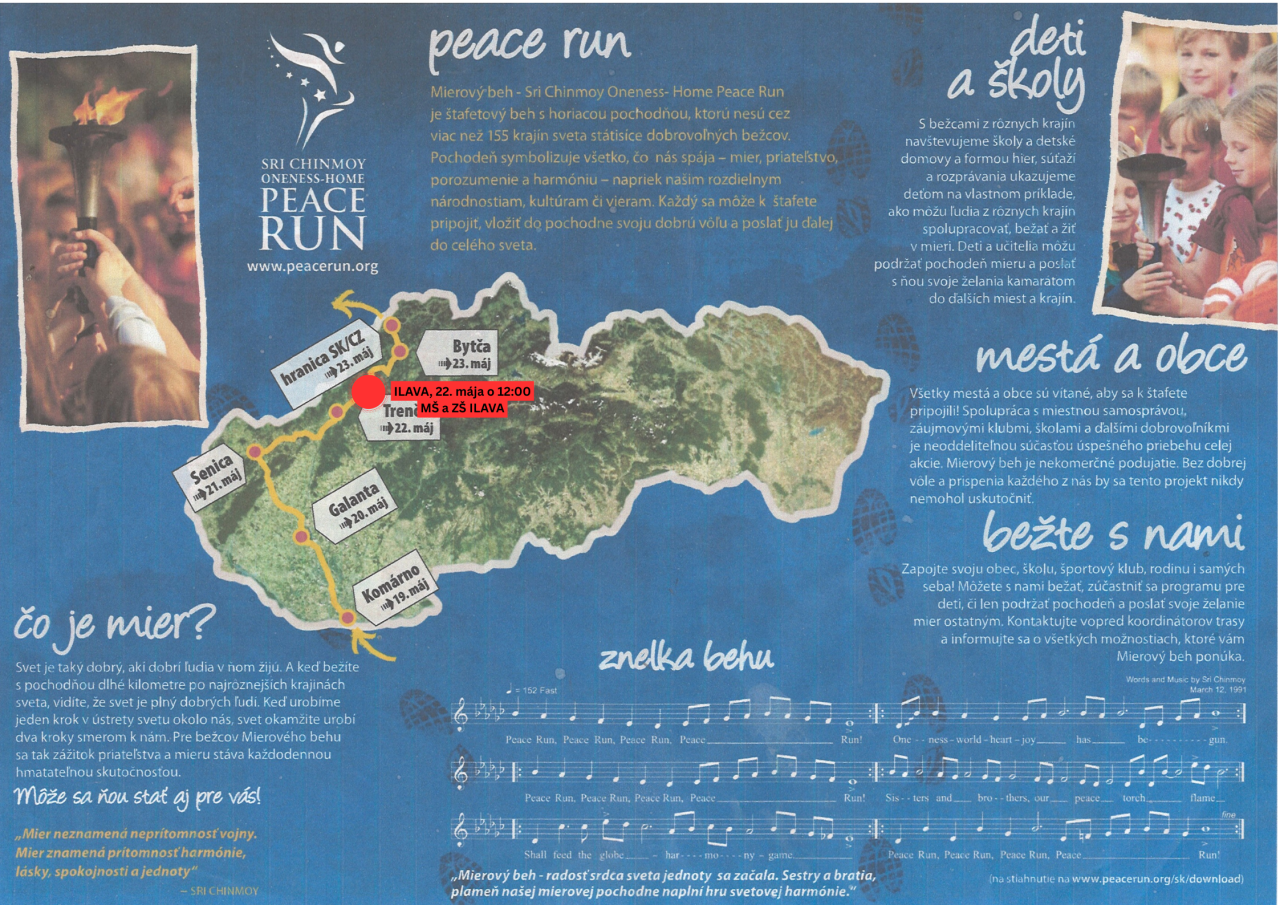 Príďte sa pozdraviť s bežcami Mierového behu, prebiehajúcimi Ilavou. Počkajte na nich už pred hranicami mesta alebo spolu so žiakmi ZŠ na Medňanskej ulici pri materskej škole a pobehnite s pochodňou aspoň niekoľko krokov.