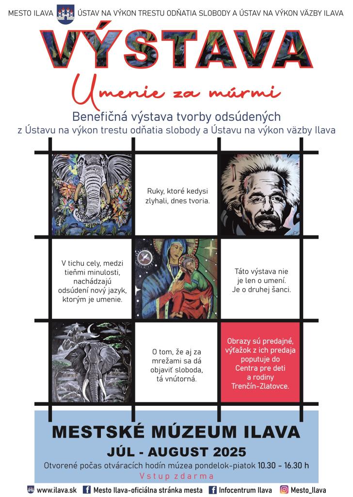 Tvorí ju 50 obrazov a výrobky z keramiky a dreva, ktoré za múrmi ilavskej väznice vytvorilo dvadsať odsúdených. Jej pridanou hodnotou je, že kúpou týchto diel prispejete Centru pre deti a rodiny v Zlatovciach. Výstavu si návštevníci ilavského múzea môžu prísť pozrieť počas letných prázdnin v pracovných dňoch od 10:30 do 16:30 hod.