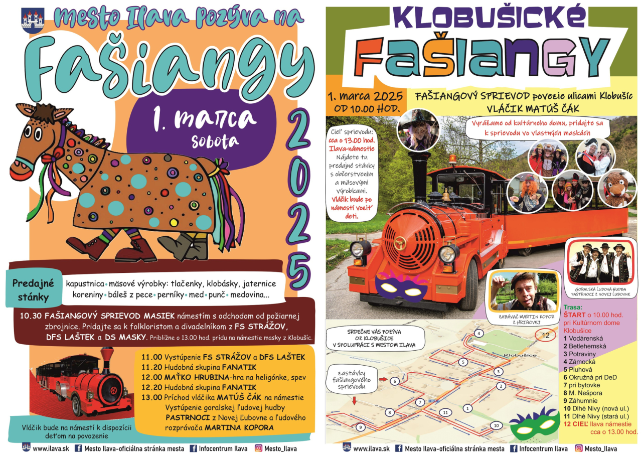 V Klobušiciach sprievod masiek štartuje o desiatej hodine od kultúrneho domu, na vláčiku postupne prejde ulicami tejto mestskej časti (podrobnosti o trase a zastávkach nájdete na mapke na priloženom plagáte). Z Klobušíc sa sprievod s maskami prepraví na ilavské námestie, čo bude približne o jednej hodine popoludní. Okrem maškarád so sebou vláčik MATÚŠ ČÁK privezie aj veselú muziku a známeho ľudového zabávača.