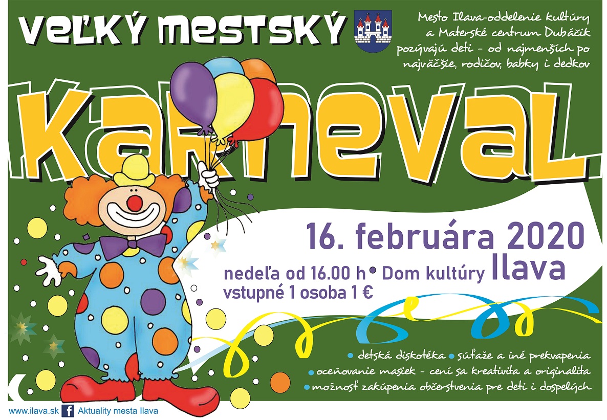 Na VEĽKÝ MESTSKÝ KARNEVAL, ktorý sa bude konať v nedeľu 16. februára o 16,00 hod. v Dome kultúry Ilava, pozývame všetkých – od najmenších po najväčších. Príďte sa s nami zabaviť :)