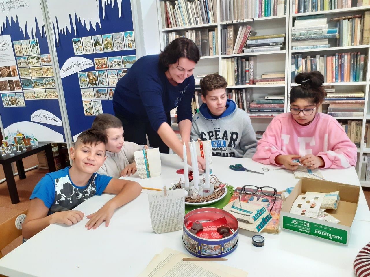 Stretnutie sa nieslo v duchu blížiacich sa sviatkov. Čítali sme príbeh Detské vianoce a debatovali o vianočných zvykoch vo svete i u nás, v našich rodinách. Rozprávali sme sa o sviatočných jedlách a rituáloch. Následne sme vyrábali darčekové taštičky, recyklovali sme poškodenú a už vyradenú knihu. Nie všetko sa musí hneď vyhodiť a deti videli, že aj zažltnuté stránky môžu s trochou fantázie získať nové využitie.