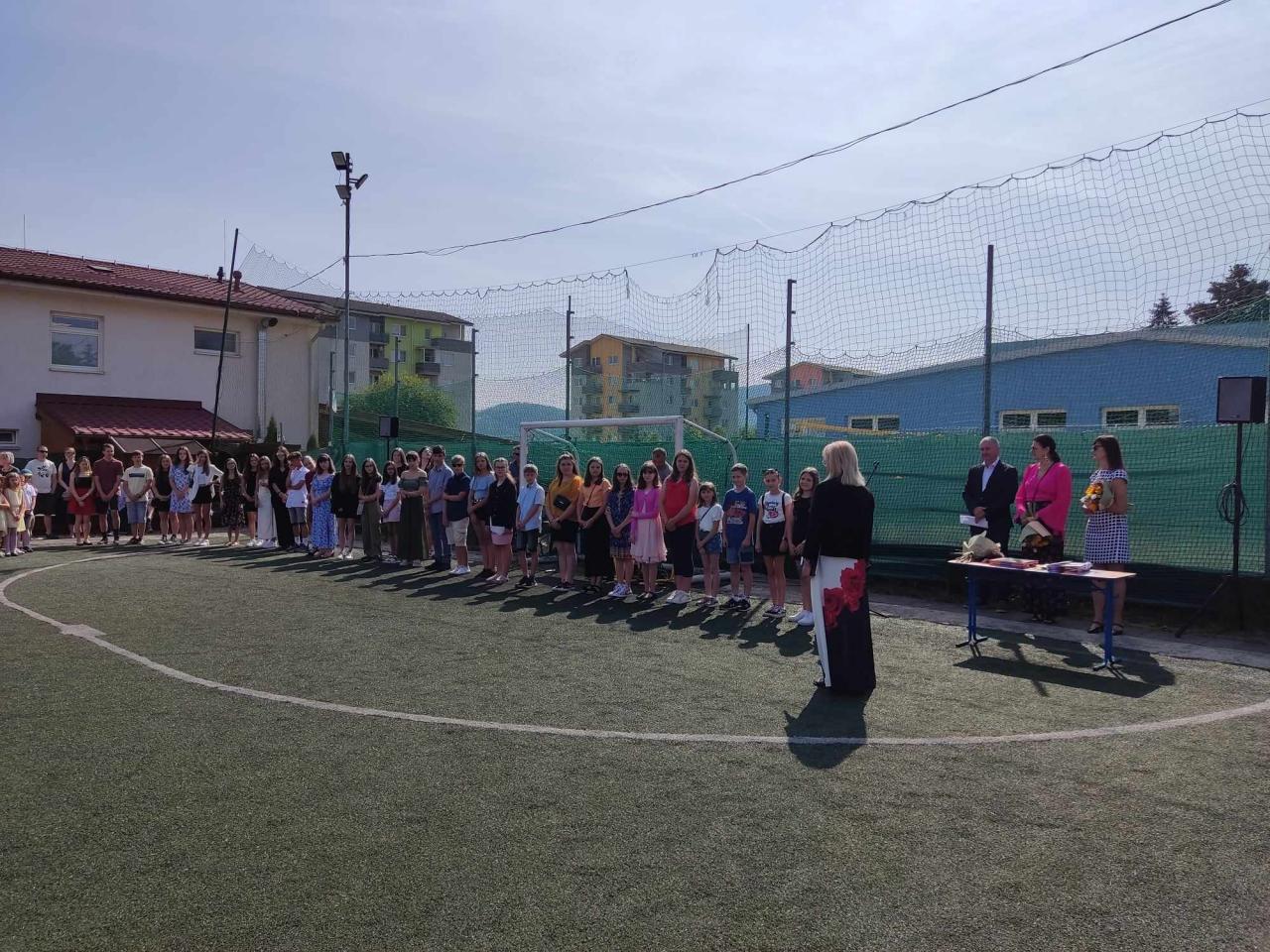 Slávnostné ukončenie školského roka patrí najmä žiakom, ktorí sa lúčia. Štvrtákom, ktorí opúšťajú prvý stupeň a samozrejme deviatakom, ktorí odchádzajú na stredné školy a čaká ich nová životná etapa. Okrem príhovorov, básničiek a piesní sa vo veľkom oceňovala. Pochvalu riaditeľky školy získalo niekoľko žiakov s tým najlepším prospechom. Tam sa však oceňovanie neskončilo. Pedagogická rada sa zhodla na mnohých ďalších menách, ktoré si zaslúžili zaujímavé odmeny. Z každého ročníka vybrali jedného žiaka alebo žiačku, ktorí vynikli nielen prospechom, ale napríklad svojou aktivitou a reprezentáciou školy. Ďalšia kategória ocenených vznikla hlavne s cieľom žiakov motivovať, aby sa vo svojich výsledkoch zlepšovali. A tak sa odmeny ušli nielen jednotkárom, ale aj takzvaným skokanom ročníka, ktorí sa oproti prvému polroku výrazne vo svojom prospechu zlepšili. Špeciálne ocenenie riaditeľka venovala aj TADEÁŠOVI HORÁKOVI za 2. miesto na Majstrovstvách Európy v karate a za reprezentáciu školy. Za najmenej vymeškaných hodín zo všetkých žiakov na 1. stupni bol ocenený FILIP HUDEC a na 2. stupni KRISTIÁN JANUCH.