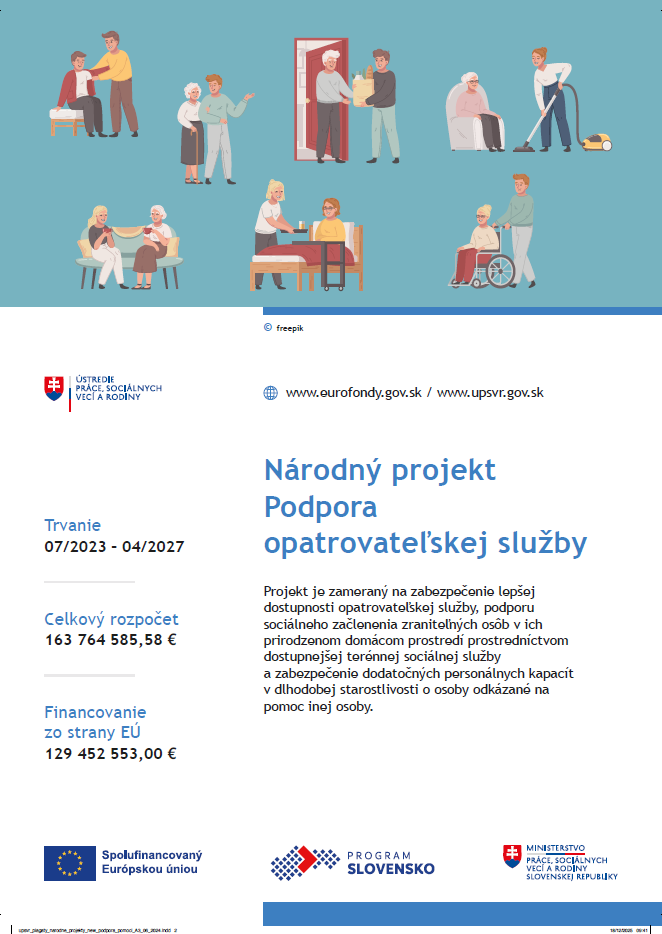 Projekt je zameraný na zabezpečenie lepšej dostupnosti opatrovateľskej služby, podporu sociálneho začlenenia zraniteľných osôb v ich prirodzenom domácom prostredí prostredníctvom dostupnejšej terénnej sociálnej služby a zabezpečenie dodatočných personálnych kapacít v dlhodobej starostlivosti o osoby odkázané na pomoc inej osoby.